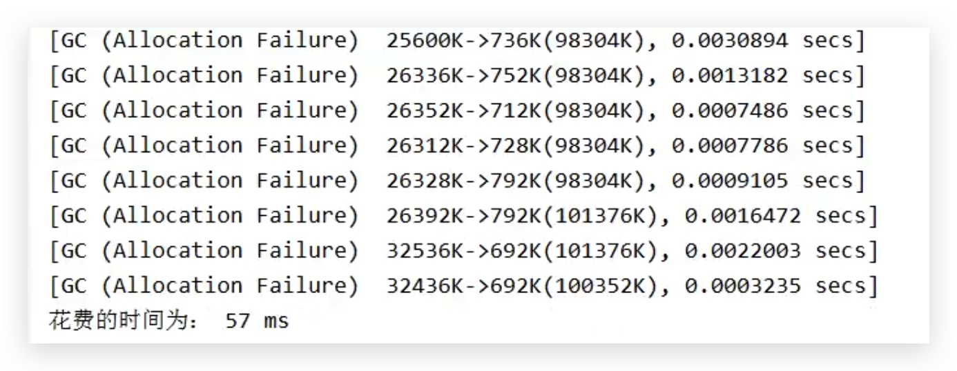 -Xmx100m -Xms100m -XX:+DoEscapeAnalysis -XX:+PrintGC -XX:-EliminateAllocations执行结果: