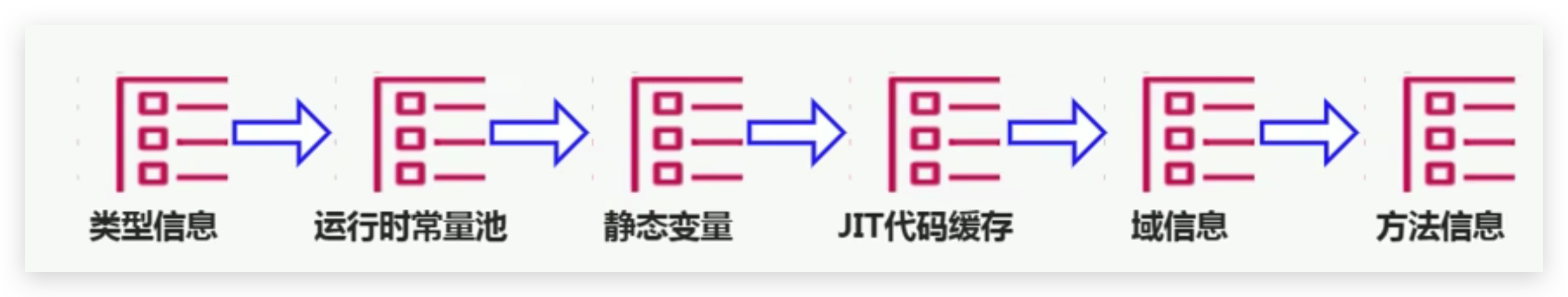 对每个加载的类型(类class、接口interface、枚举enum、注解annotation),JVM必须在方法区中存储以下类型信息: