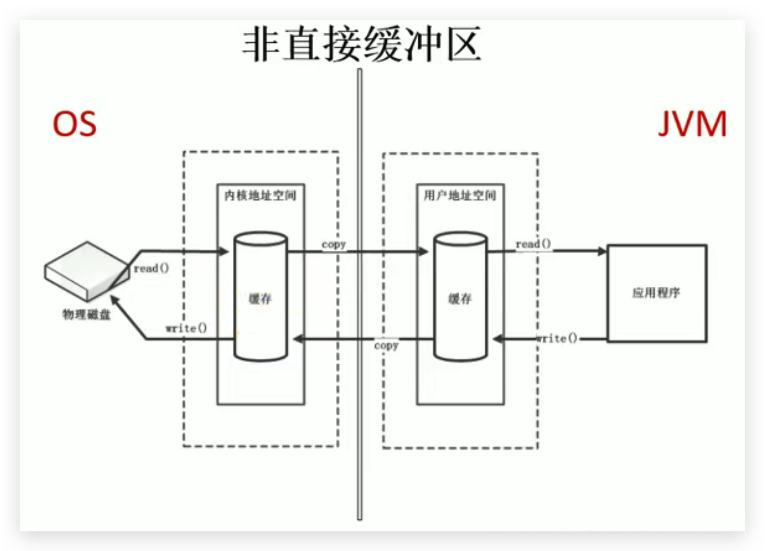 读写文件,需要与磁盘交互,需要由用户态切换到内核态。在内核态和用户态时,都需要内存,并且是使用IO(Stream流,通常由byte[]或者char[]组成)的方式。这里需要两份内存存储重复数据,效率低。