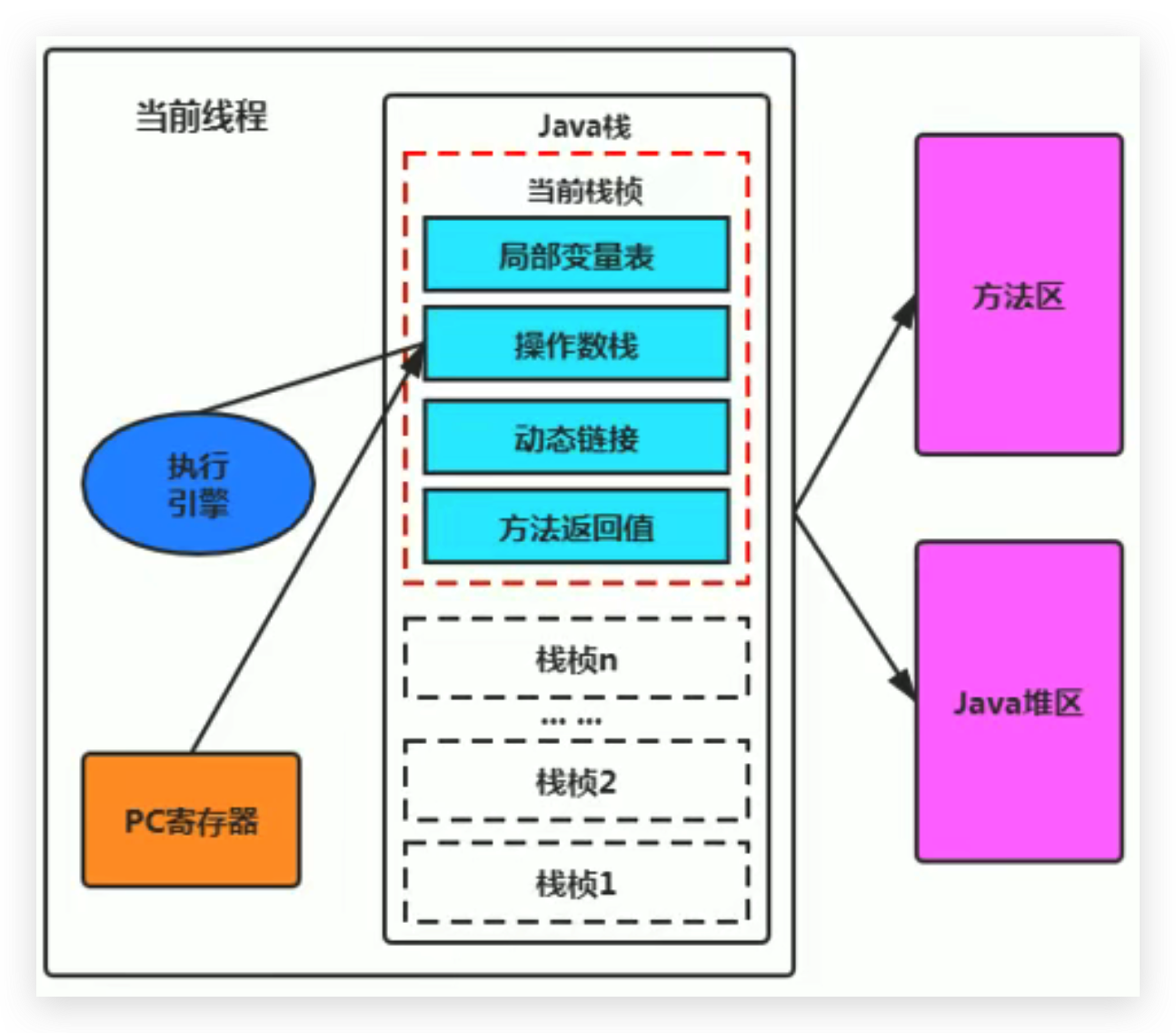 - 方法在执行的过程中,执行引擎有可能会通过存储在局部变量表中的对象引用准确定位到存储在Java堆区中的对象实例信息,以及通过对象头中的元数据指针定位到目标对象在方法区中的类型信息。