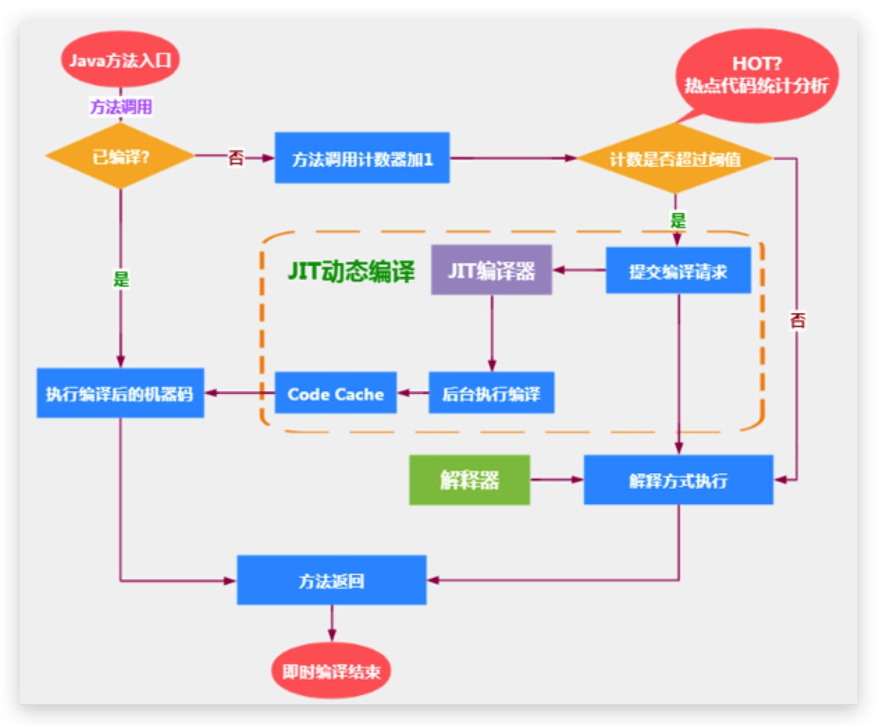 - 是否需要启动JIT编译器将字节码直接编译为对应平台的本地机器指令,则需要根据代码被调用