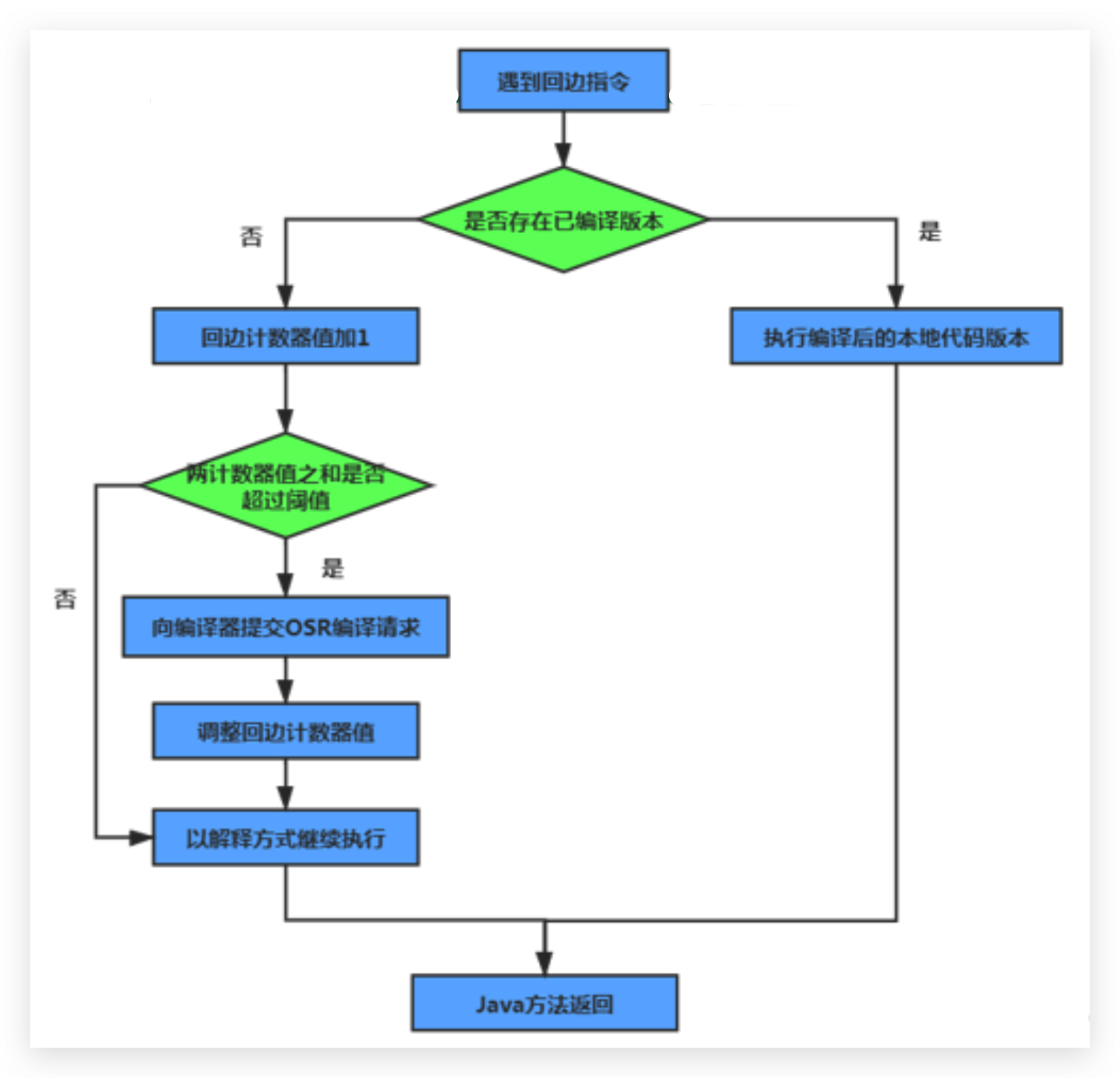 它的作用是统计一个方法中循环体代码执行的次数,在字节码中遇到控制流向后跳转的指令称为“回边”(Back Edge)。显然,建立回边计数器统计的目的就是为了触发OSR编译。