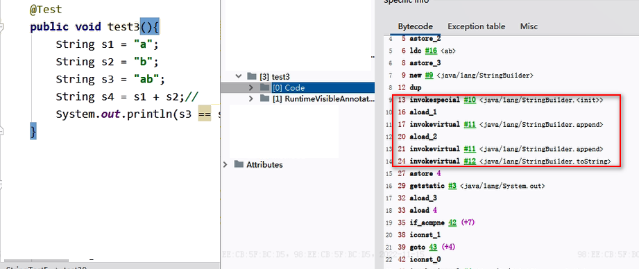 - 拼接前后,只要其中有一个是变量,结果就在堆中(区别于1中的堆,在常量池之外的堆中)。变量拼接的原理是StringBuilder