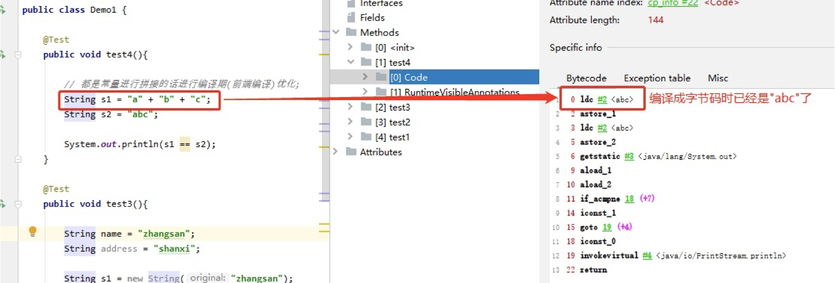 结论:常量与常量的拼接结果在常量池,原理是编译期优化