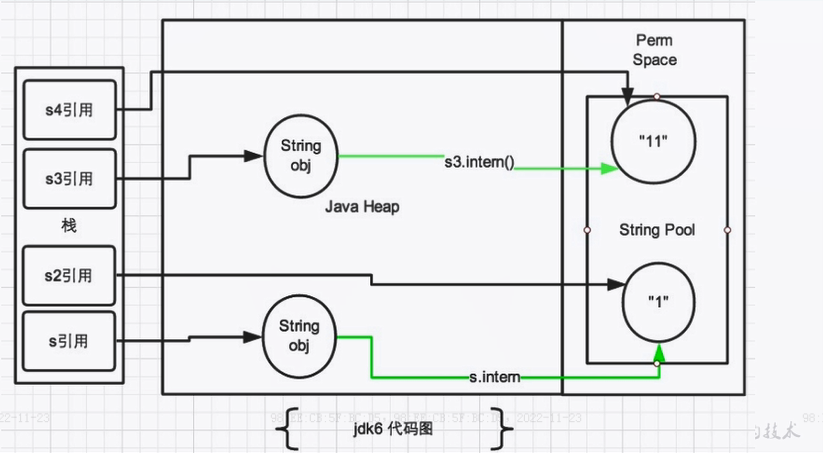 - 在JDK6的版本中,字符串常量池还在永久代,所以直接在永久代生成”11”,也就有了新的地址