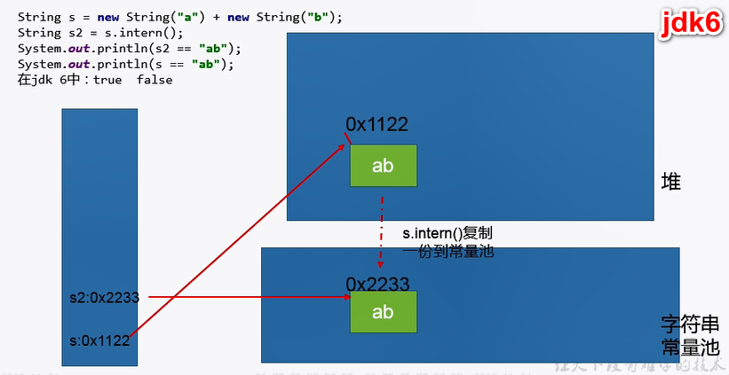 - 首先在jdk6中,字符串常量池是在永久代,即方法区中,而对象是分配在堆中,所以他们的地址永远不相等;
