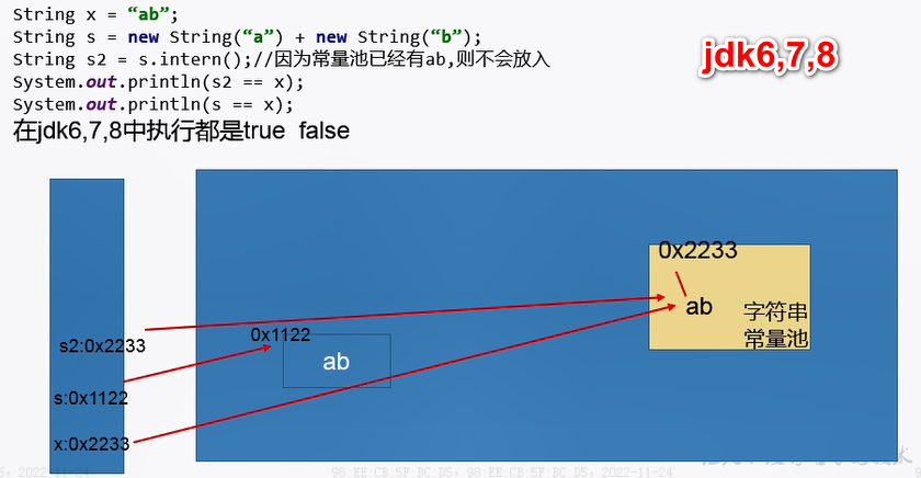 执行第四行代码后,若是jdk6:在字符串常量池(此时在永久代)中创建一个字符串”ab”;若是jdk7/8:字符串常量池(此时在堆中)中没有创建字符串”ab”,而是创建一个引用,指向new String(“ab”), 将此引用返回