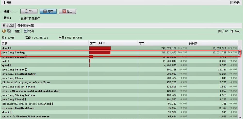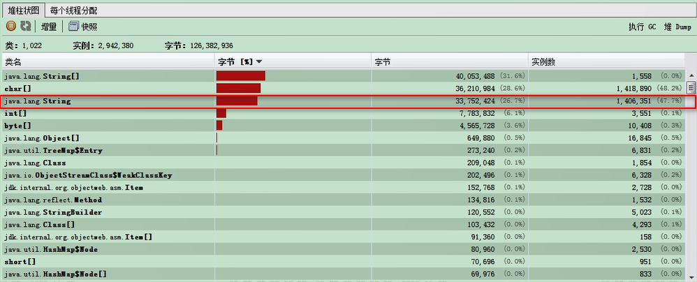 采用第10行执行的话,相当于直接 new String :由于每个 String 对象都是 new 出来的,所以程序需要维护大量存放在堆空间中的 String 实例,程序内存占用也会变高,如图: