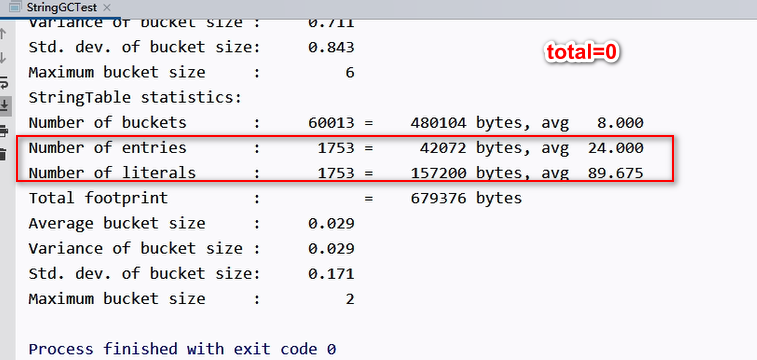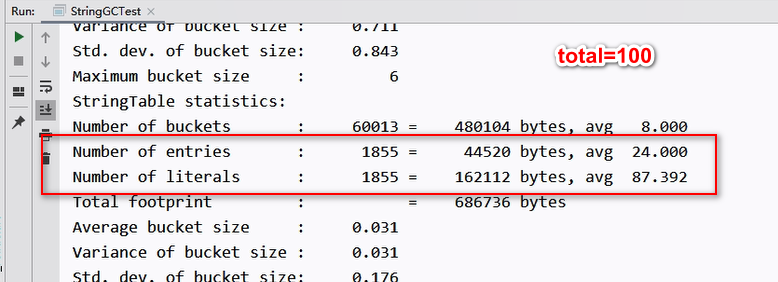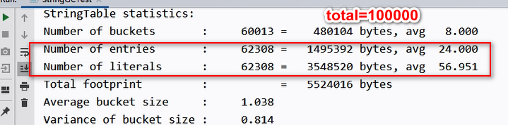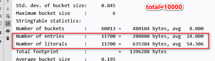 依次把total的数值从0改到100000,打印出字符串常量池的大小,如图: