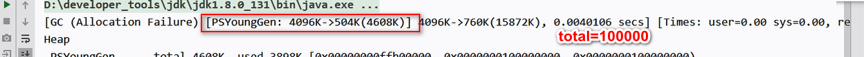 以上分析得出当total为100000时,实际上字符串常量池里面是没有增加十万个的,因为发生了GC(YoungGC ),如图: