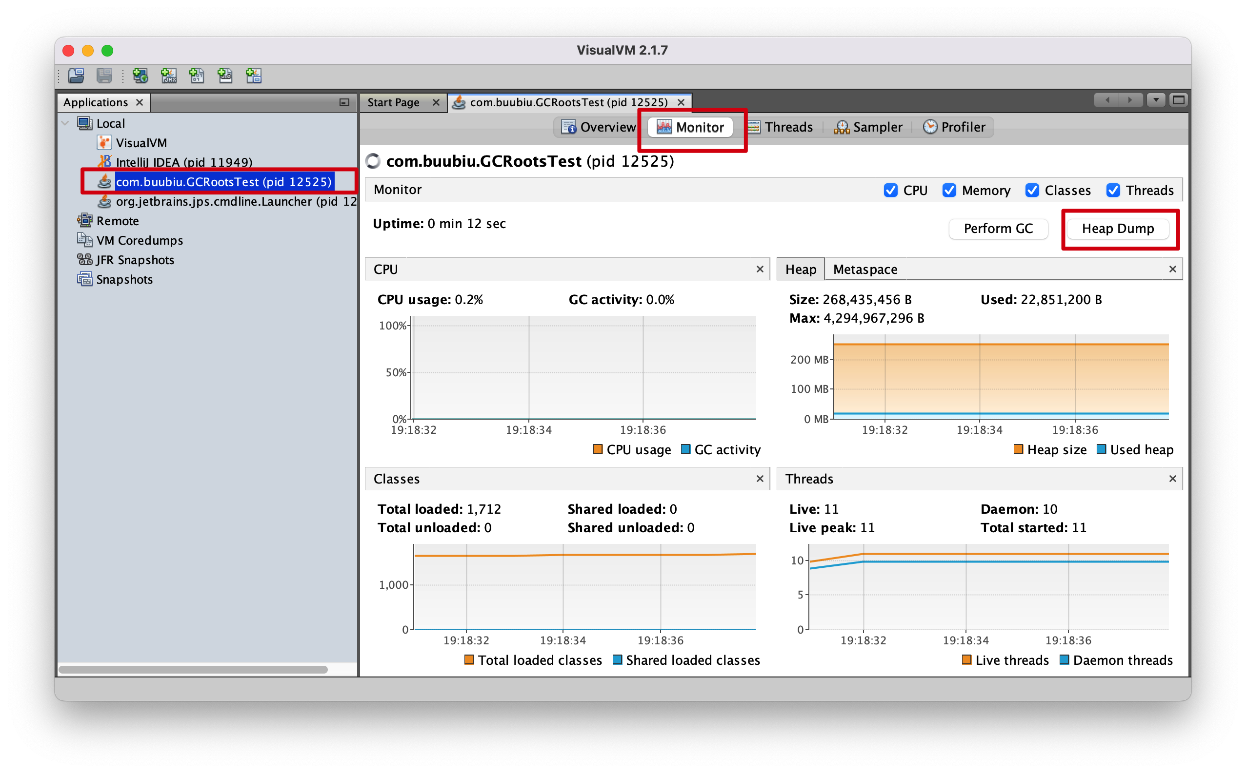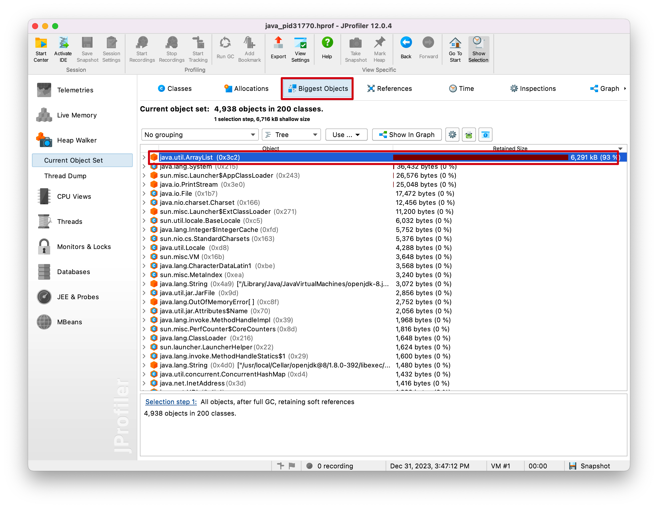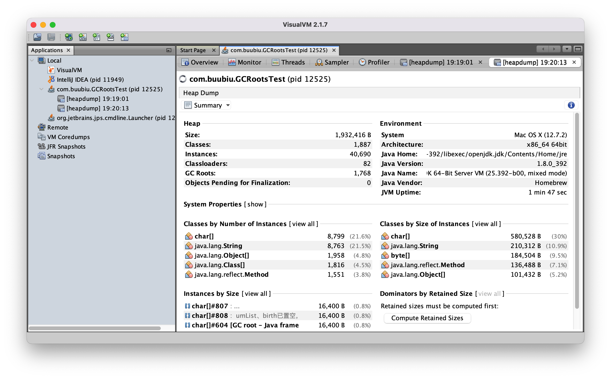 下面使用 JProfiler 进行 GC Roots 溯源演示