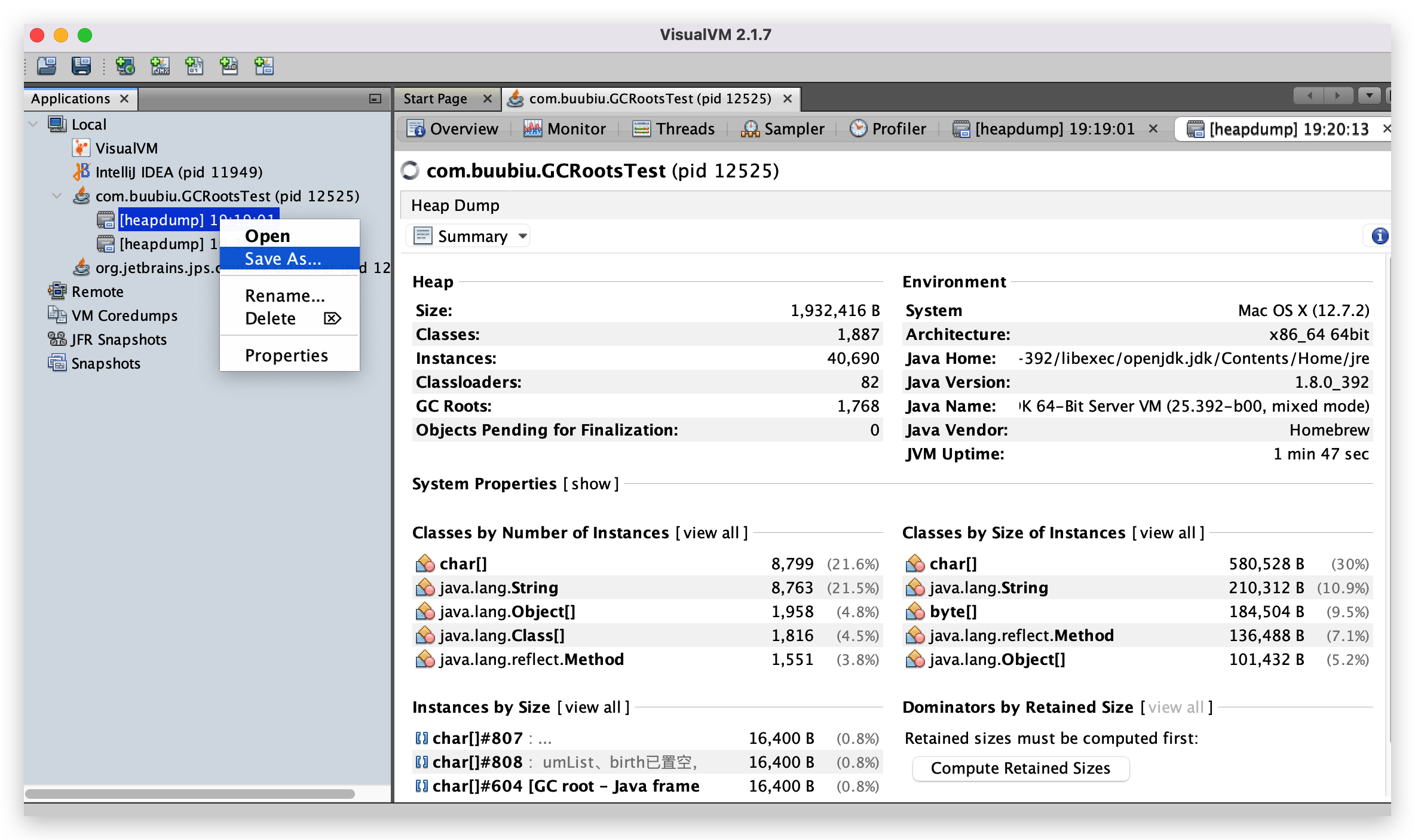 方式二:使用JVisualVM 捕获的heap dump文件是一个临时文件,关闭JVisualVM后自动删除,若要保留,需要将其另存为文件。