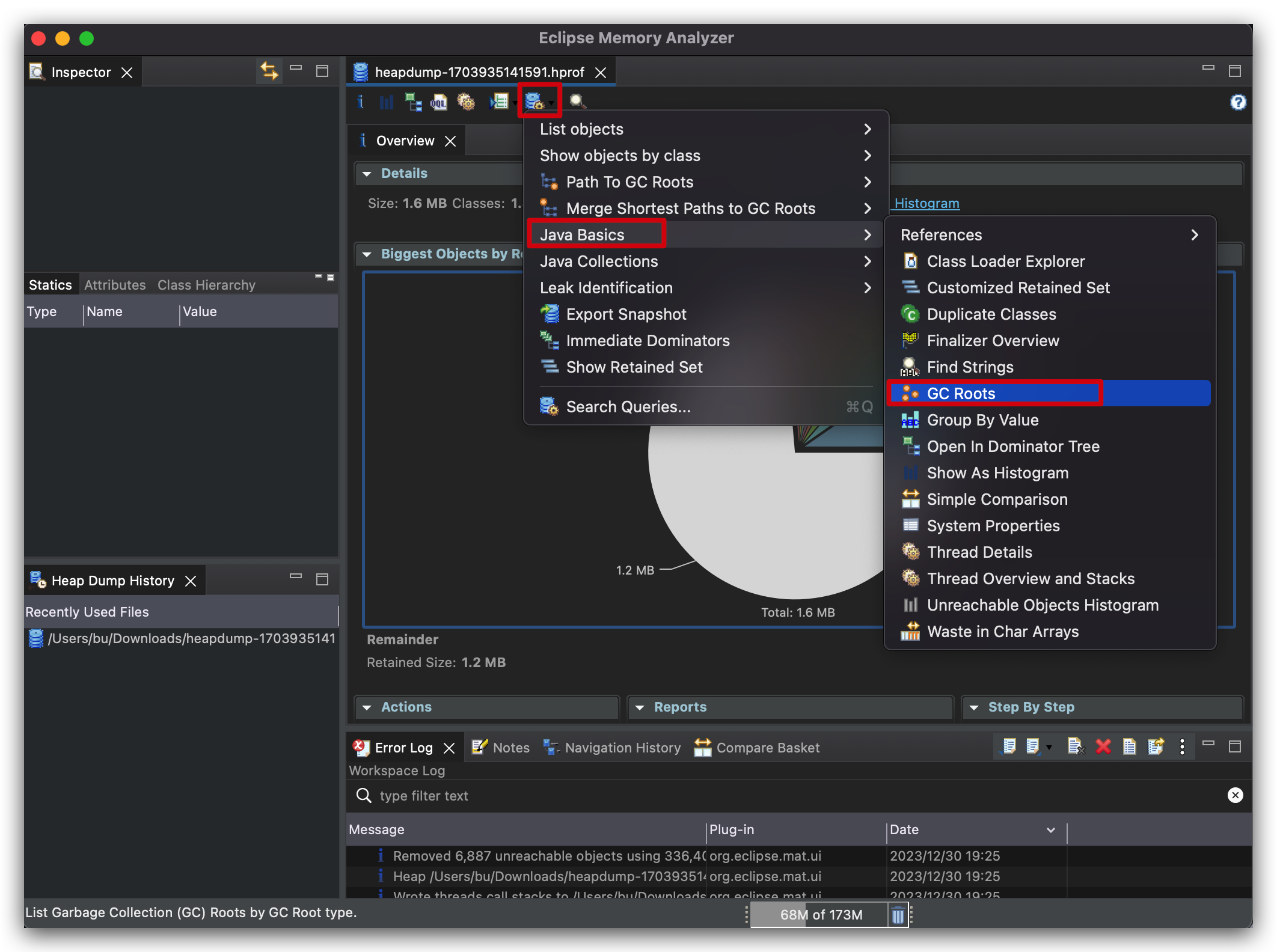 打开 MAT ,选择File –> Open File,打开刚刚的两个dump文件,我们先打开第一个dump文件