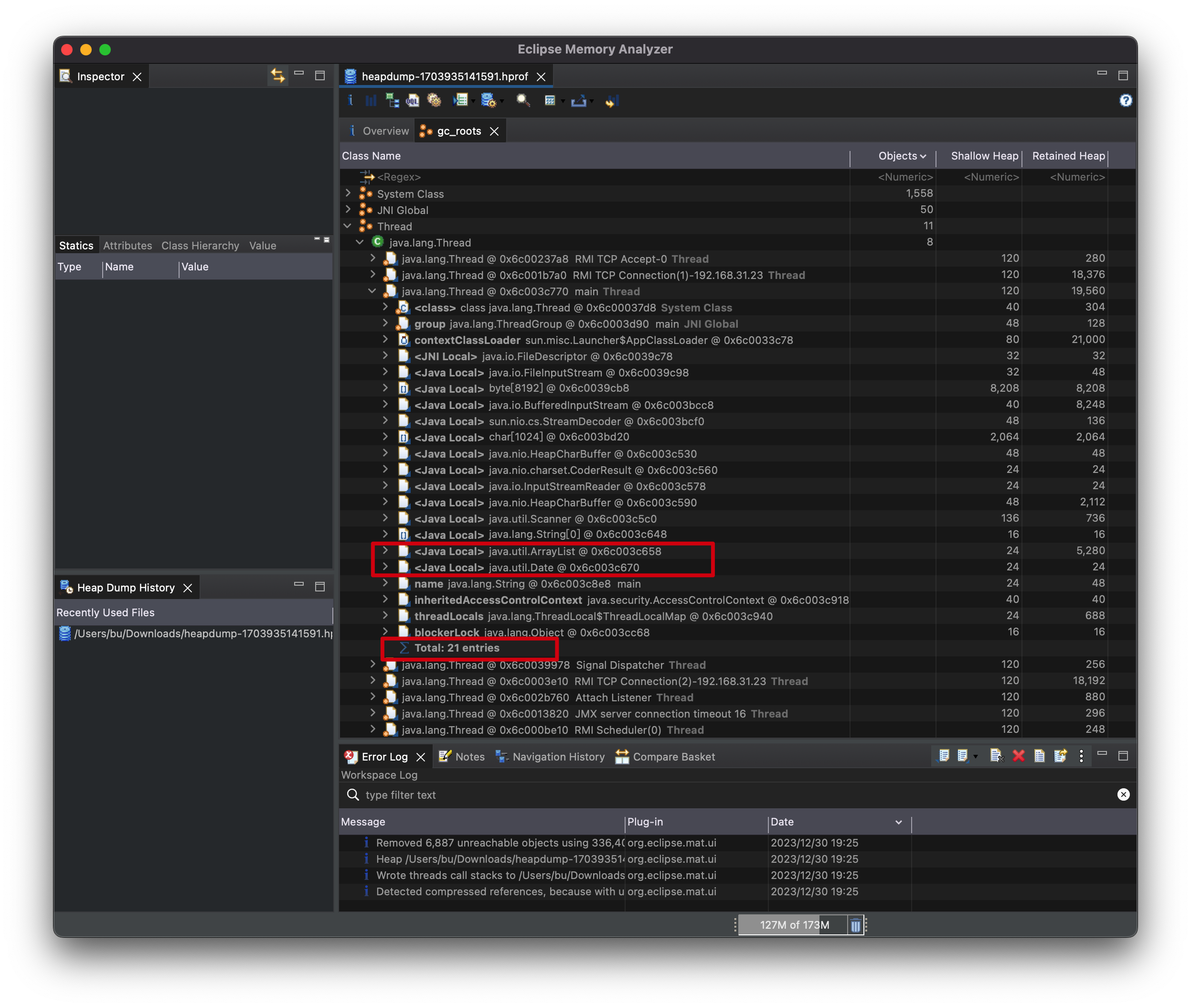 第一次捕捉堆内存快照时,GC Roots 中包含代码定义的两个局部变量,类型分别为 ArrayList 和 Date,Total:21