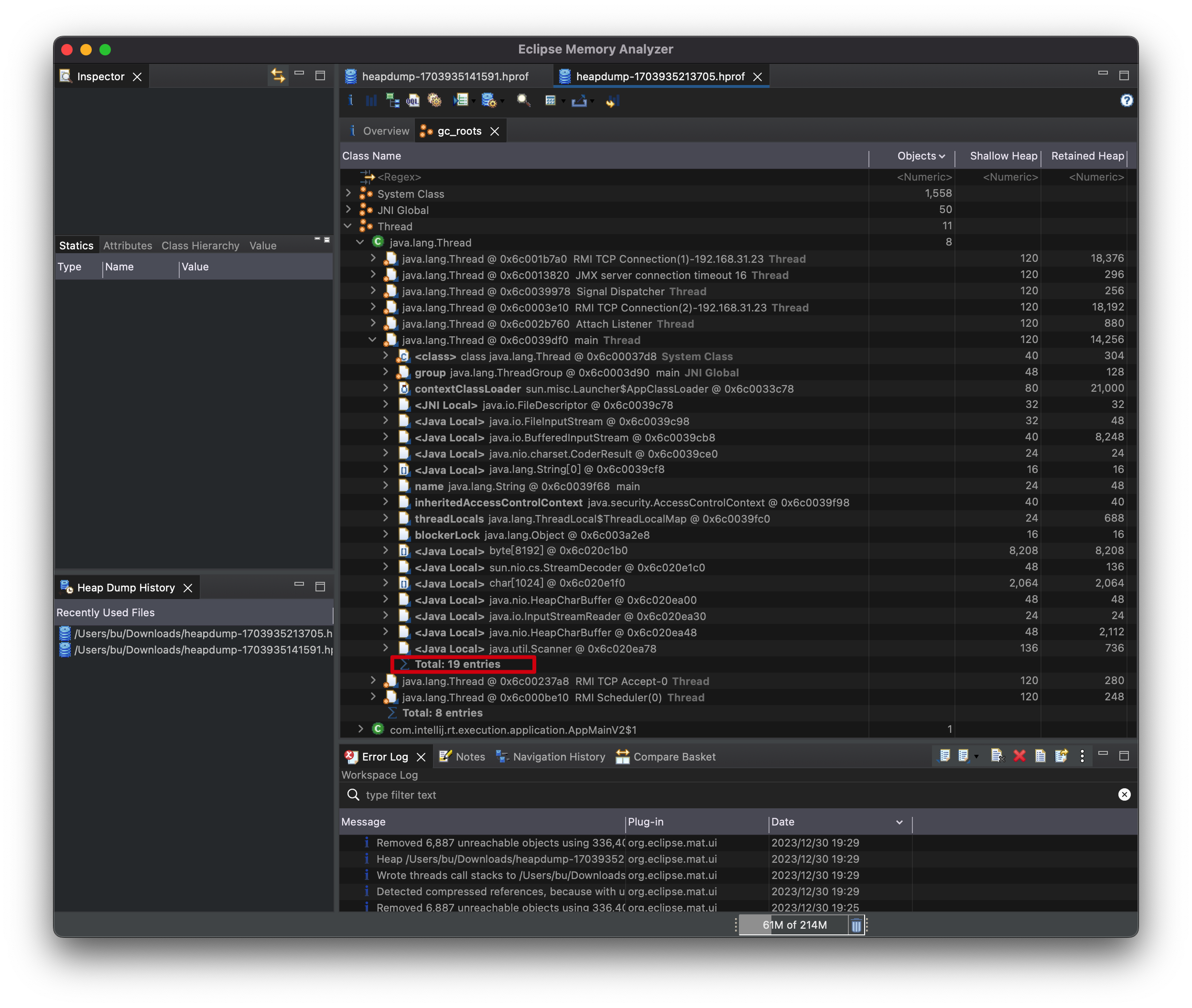 打开第二个dump文件,第二次捕获内存快照时,由于两个局部变量引用的对象被释放,所以这两个局部变量不再作为 GC Roots ,从 Total Entries = 19 也可以看出(少了两个 GC Roots)
