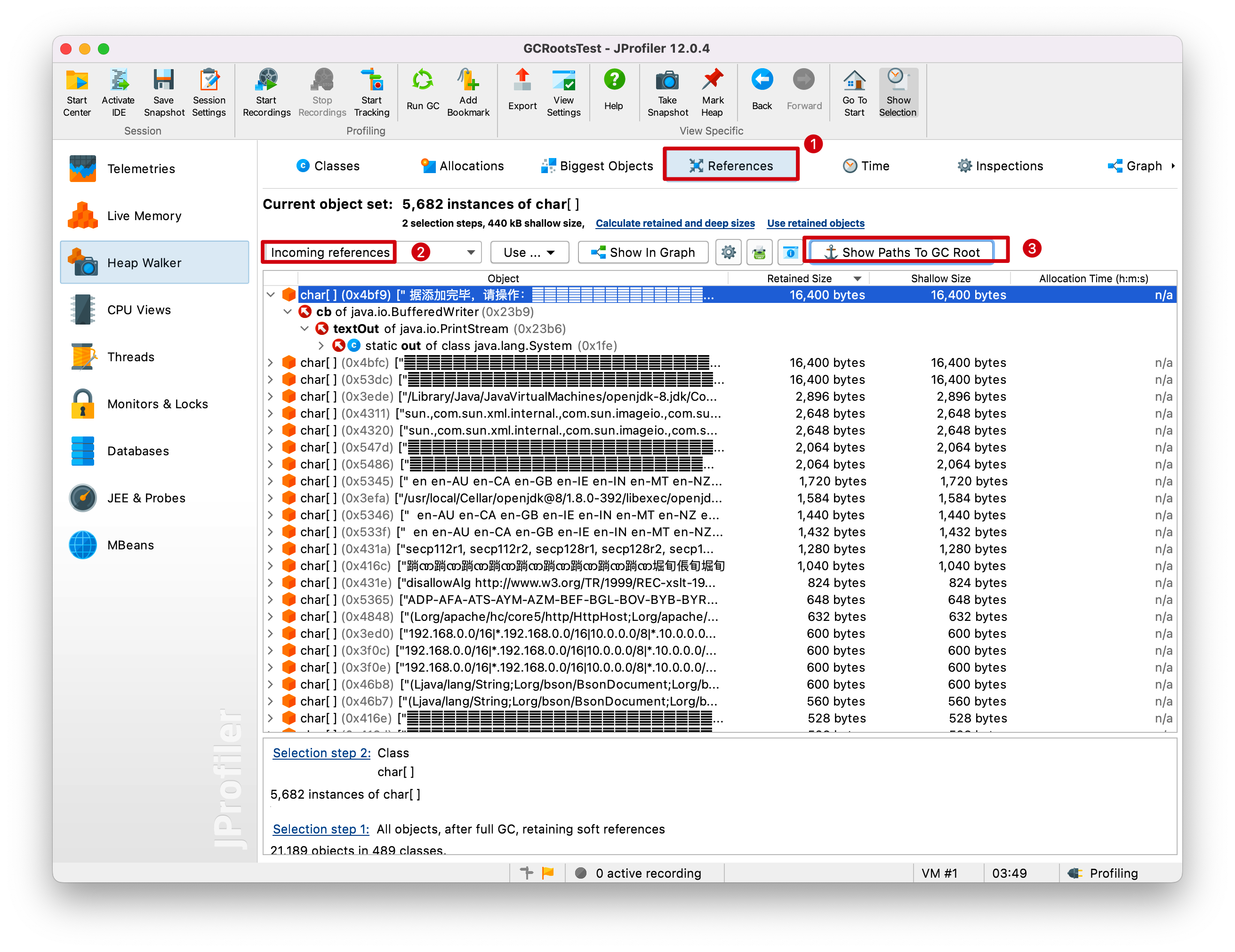 JProfiler GC Roots 溯源 在实际开发中,很少会查看所有的GC Roots。一般都是查看某一个或几个对象的GC Root是哪个,这个过程叫GC Roots 溯源