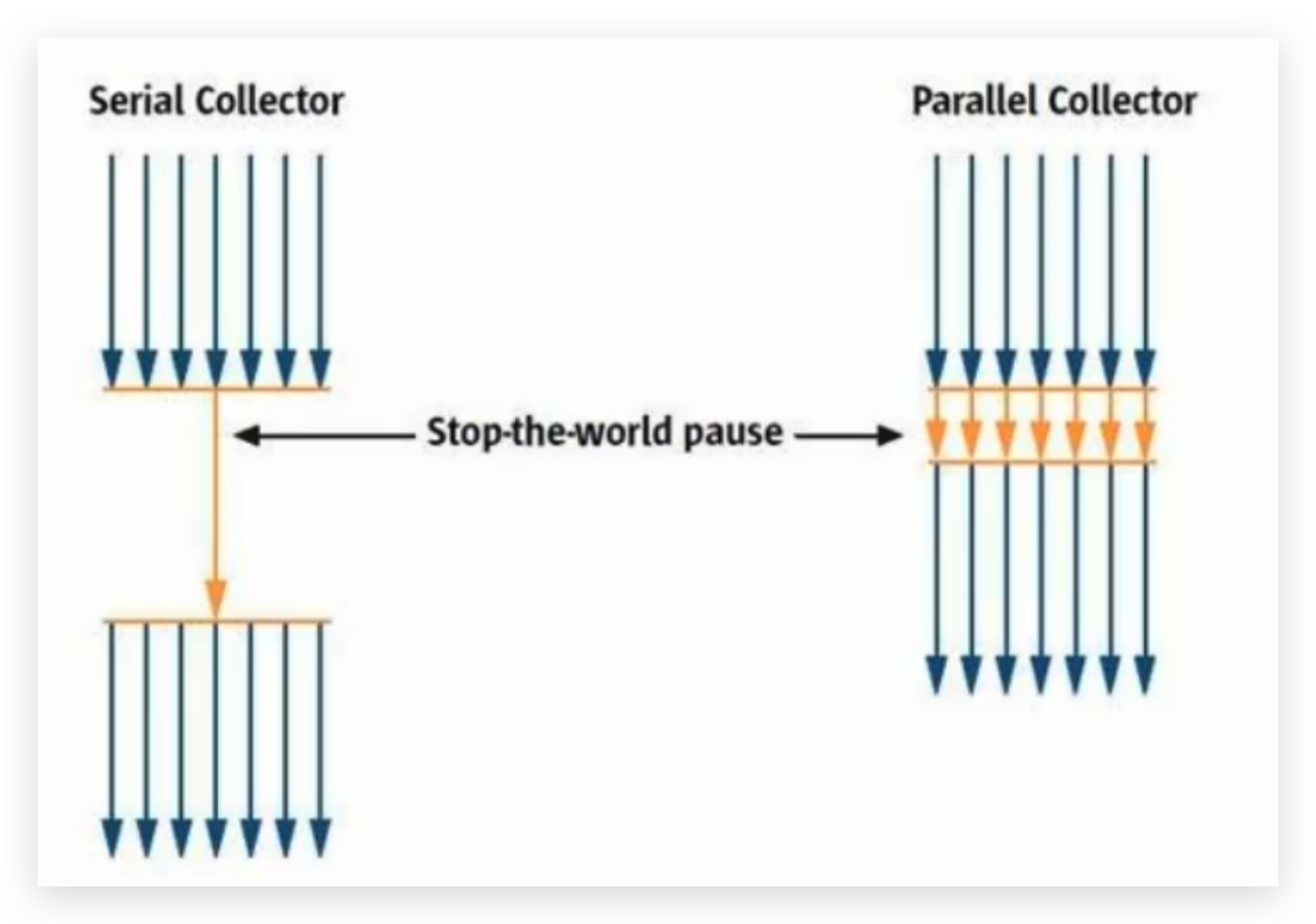 - 在并发能力比较强的CPU上,并行回收器产生的停顿时间要短于串行回收器。