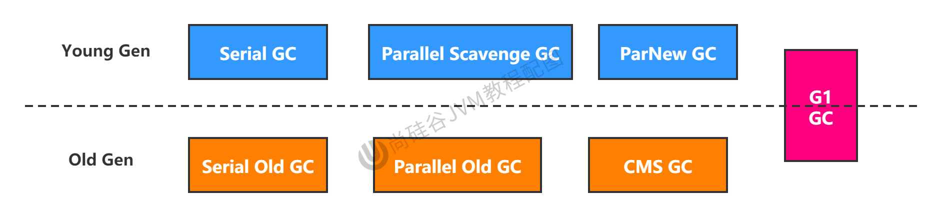 - JDK9可选:Serial/Serial old、ParNew/CMS、Parallel Scavenge/Serial Old、Parallel Scavenge/Parallel Old、G1(默认)