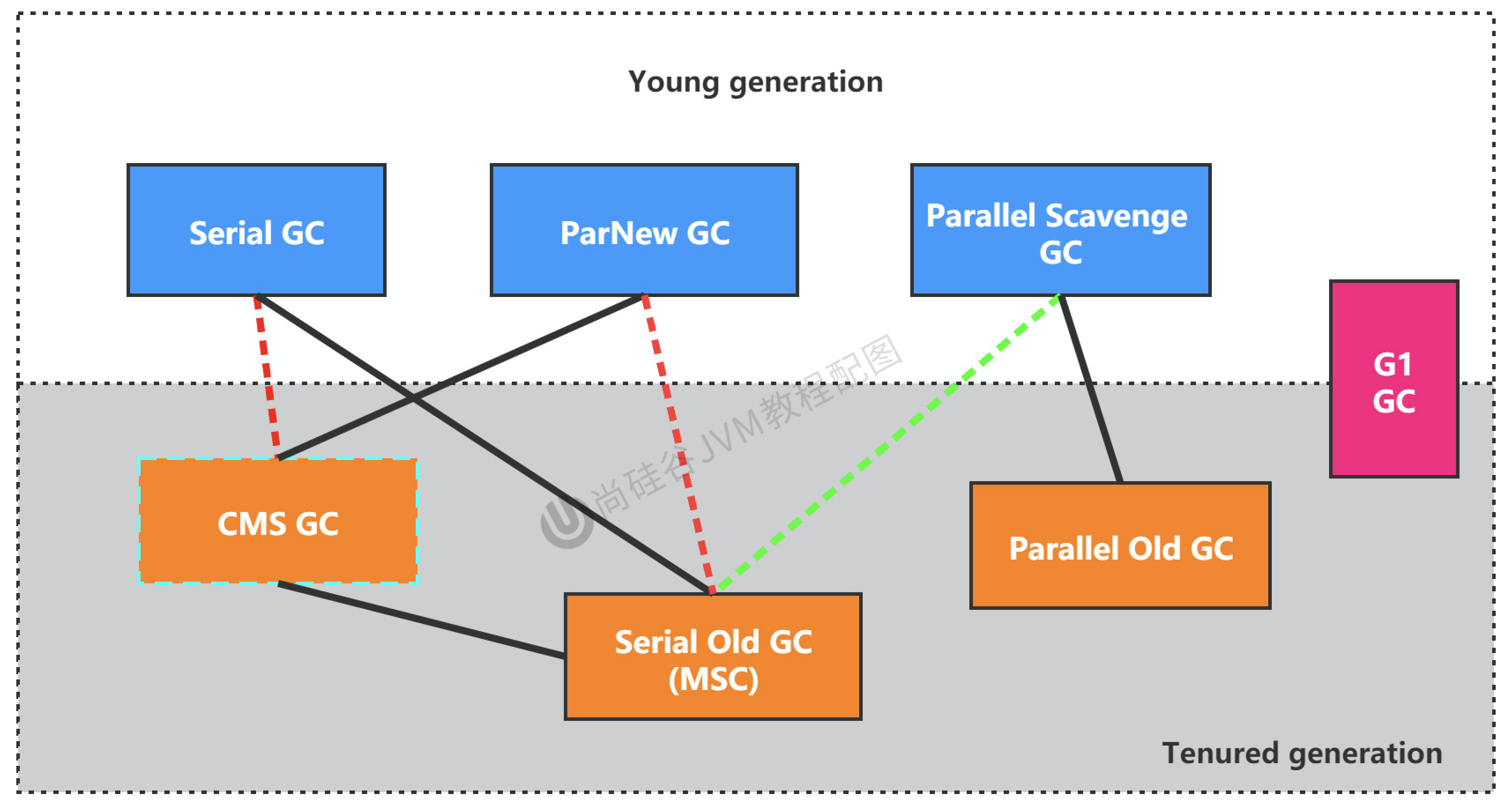 (红色虚线)由于维护和兼容性测试的成本,在JDK 8时将Serial+CMS、ParNew+Serial Old这两个组合声明为废弃(JEP173),并在JDK9中完全取消了这些组合的支持(JEP214),即:移除。