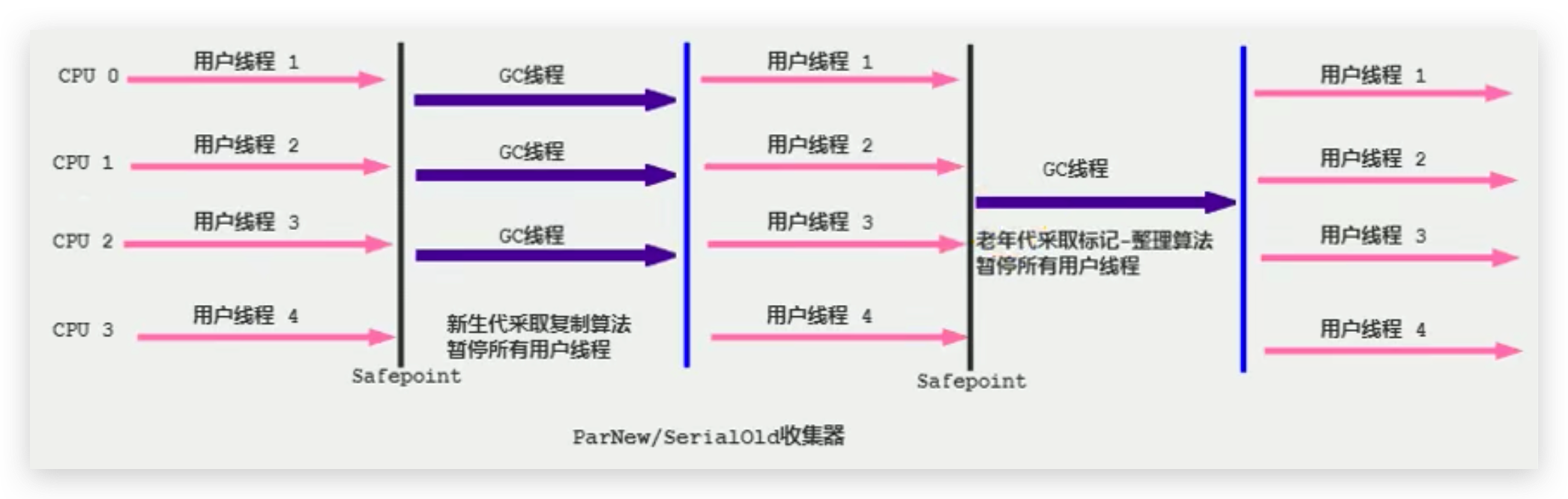 -XX:+UseParNewGC手动指定使用ParNew收集器执行内存回收任务。它表示年轻代使用并行收集器,不影响老年代 ,老年代默认使用Serial Old。 - -XX:ParallelGCThreads限制线程数量,默认开启和CPU数据相同的线程数。