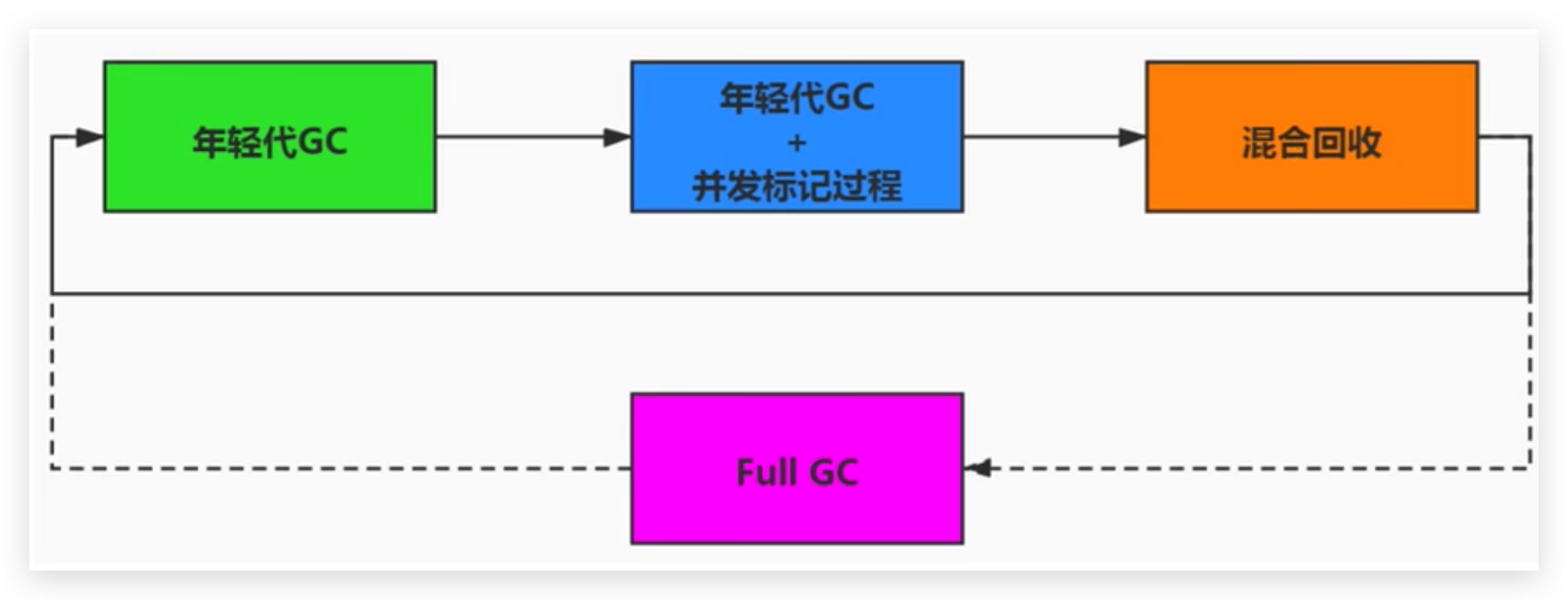 顺时针,Young GC –> Young GC+Concurrent Marking –> Mixed GC顺序,进行垃圾回收