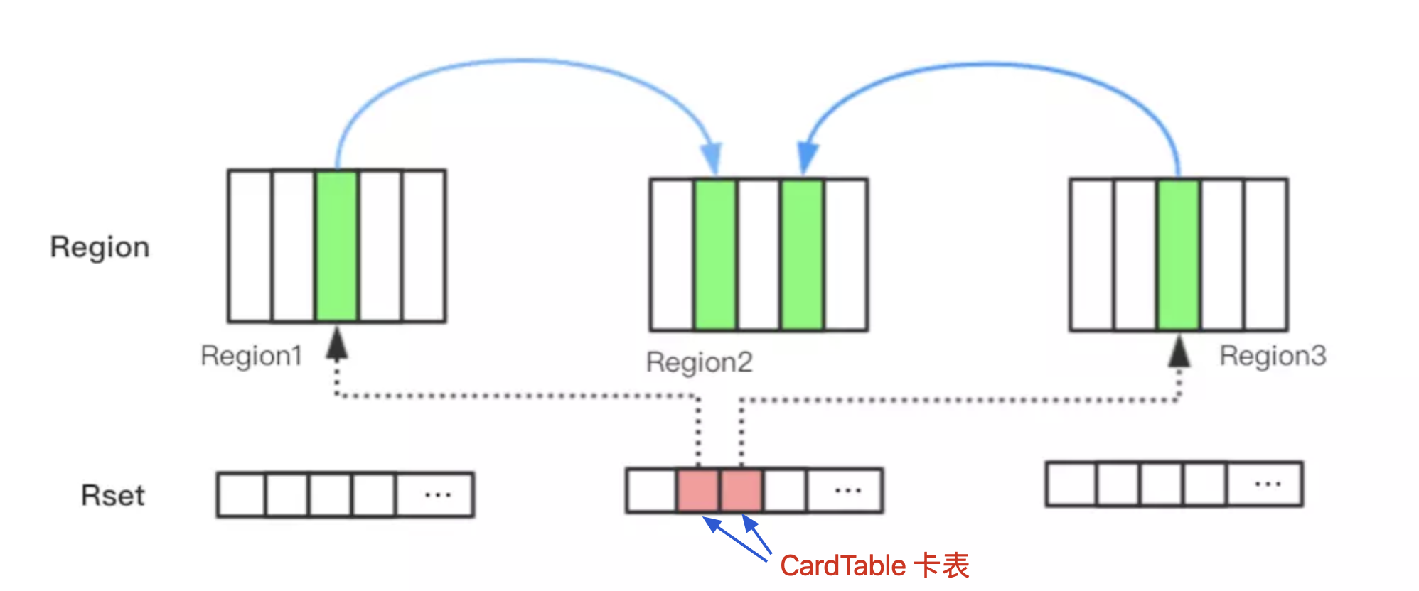 CardTable(卡表)把相关引用信息记录到引用指向对象的所在Region对应的Remembered Set中;当进行垃圾收集时,在GC根节点的枚举范围加入Remembered Set;就可以保证不进行全局扫描,也不会有遗漏。