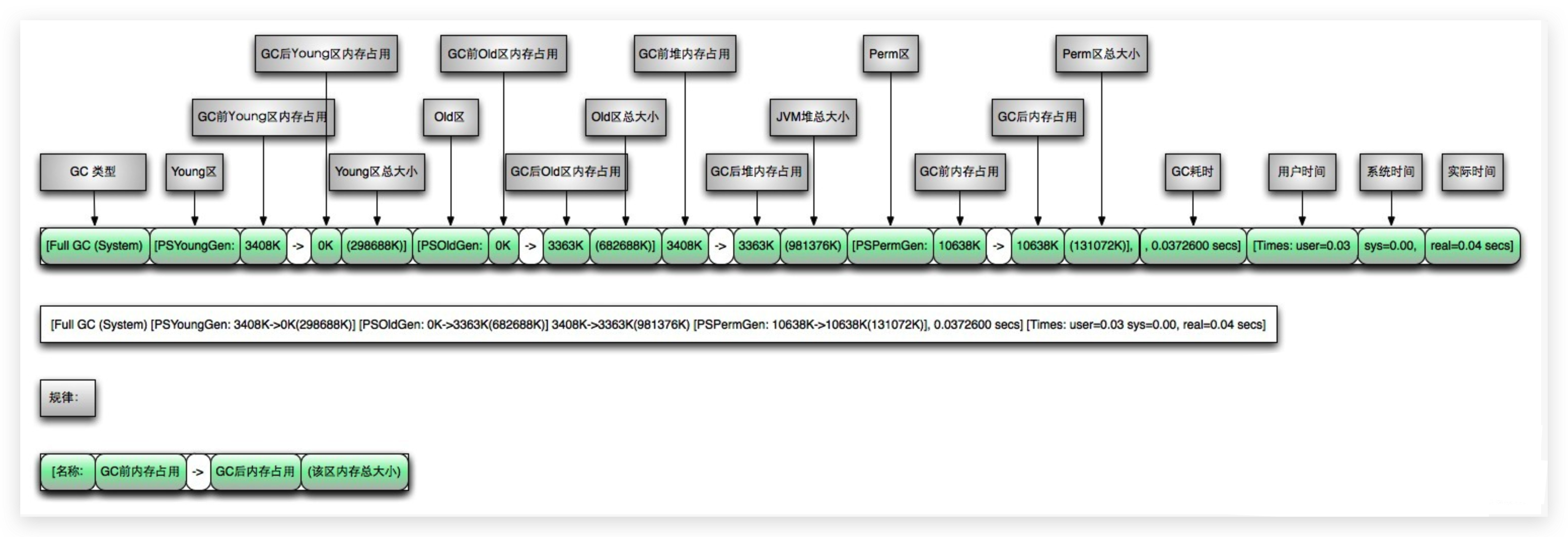[GC和[Full GC说明了这次垃圾收集器的类型,如果有”Full”则说明GC发生了”Stop The World”如果使用Serial收集器在新生代的名字是Default New Generation,显示的是”[DefNew”