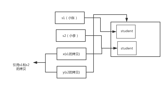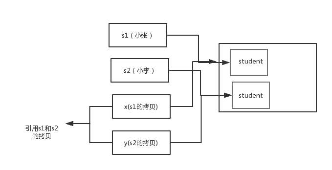 通过上面两张图可以很清晰的看出: 方法并没有改变存储在变量 s1 和 s2 中的对象引用。swap 方法的参数 x 和 y 被初始化为两个对象引用的拷贝,这个方法交换的是这两个拷贝