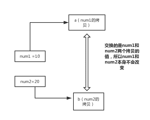 在 swap 方法中,a、b 的值进行交换,并不会影响到 num1、num2。因为,a、b 中的值,只是从 num1、num2 的复制过来的。也就是说,a、b 相当于 num1、num2 的副本,副本的内容无论怎么修改,都不会影响到原件本身。