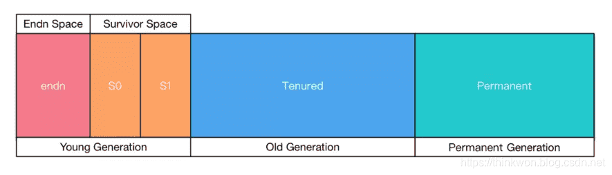 当前商业虚拟机都采用分代收集的垃圾收集算法。分代收集算法,顾名思义是根据对象的存活周期将内存划分为几块。一般包括年轻代、老年代 和 永久代,如图所示: