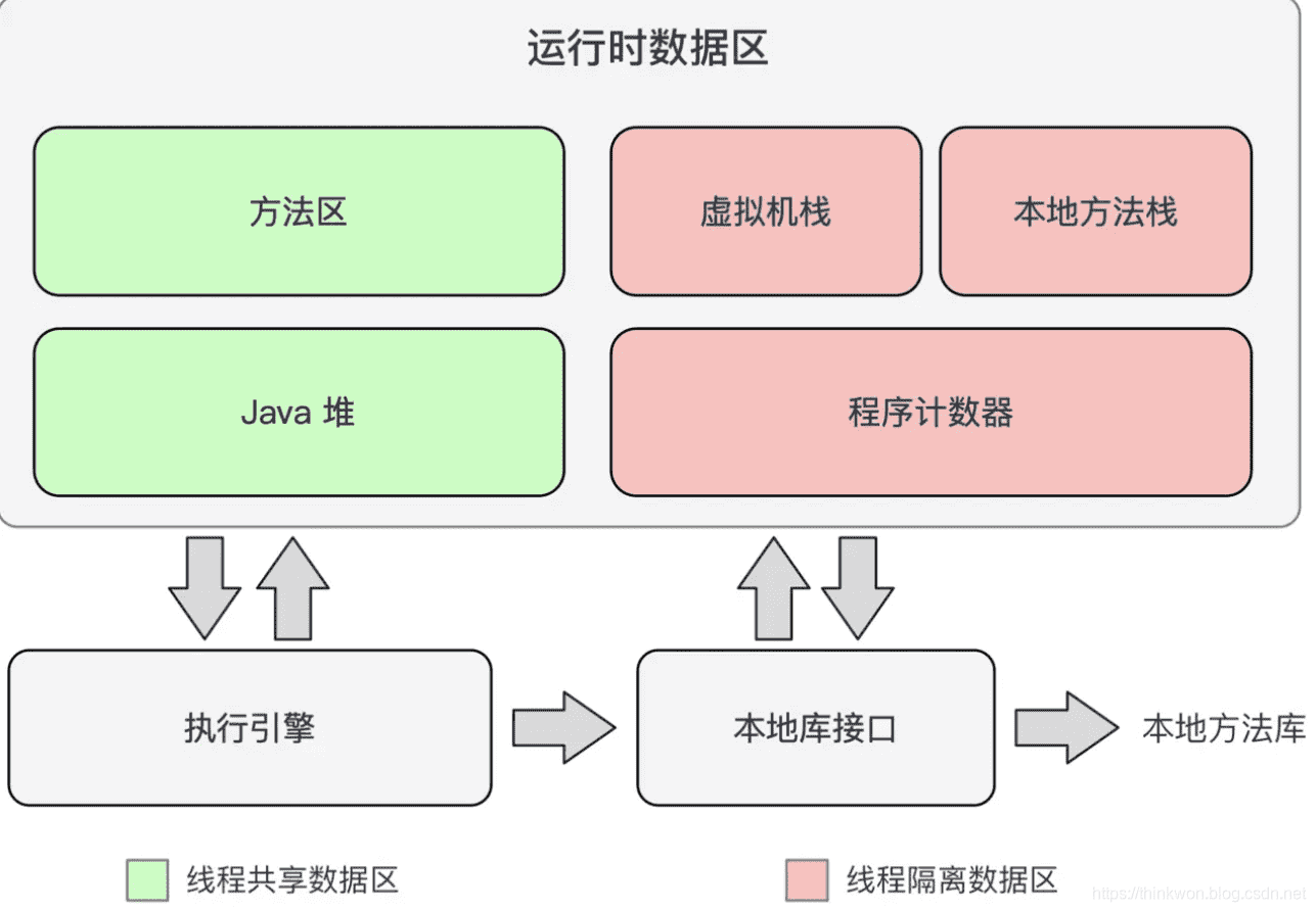 作用 :首先通过编译器把 Java 代码转换成字节码,类加载器(ClassLoader)再把字节码加载到内存中,将其放在运行时数据区(Runtime data area)的方法区内,而字节码文件只是 JVM 的一套指令集规范,并不能直接交给底层操作系统去执行,因此需要特定的命令解析器执行引擎(Execution Engine),将字节码翻译成底层系统指令,再交由 CPU 去执行,而这个过程中需要调用其他语言的本地库接口(Native Interface)来实现整个程序的功能。