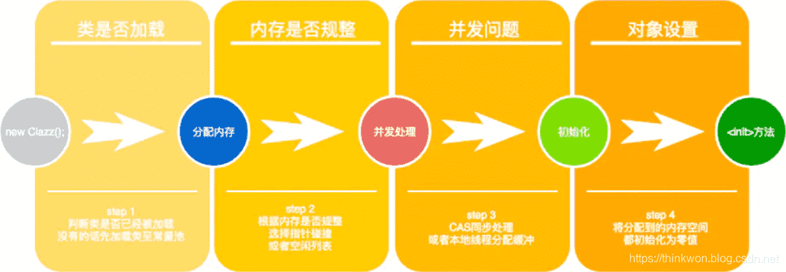 虚拟机遇到一条new指令时,先检查常量池是否已经加载相应的类,如果没有,必须先执行相应的类加载。类加载通过后,接下来分配内存。若Java堆中内存是绝对规整的,使用“指针碰撞“方式分配内存;如果不是规整的,就从空闲列表中分配,叫做”空闲列表“方式。划分内存时还需要考虑一个问题-并发,也有两种方式: CAS同步处理,或者本地线程分配缓冲(Thread Local Allocation Buffer, TLAB)。然后内存空间初始化操作,接着是做一些必要的对象设置(元信息、哈希码…),最后执行<init>方法。
