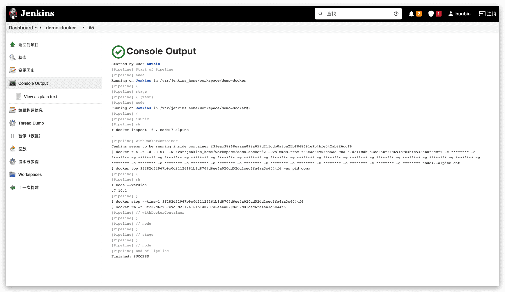 pipeline插件从2.5版本开始就内置了Docker插件,与之前不同的,在agent部分我们将node换成了docker。