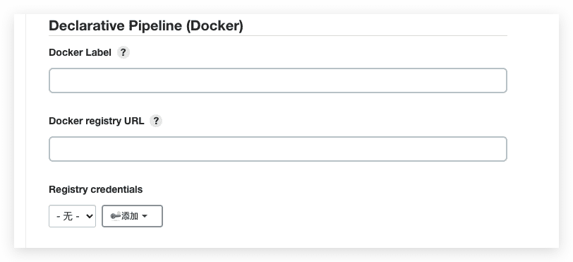 - Docker Label:当 pipeline 中的 agent 部分没有指定 label 选项时,就会使用此配置。如docker {image’maven:3-alpine’}。