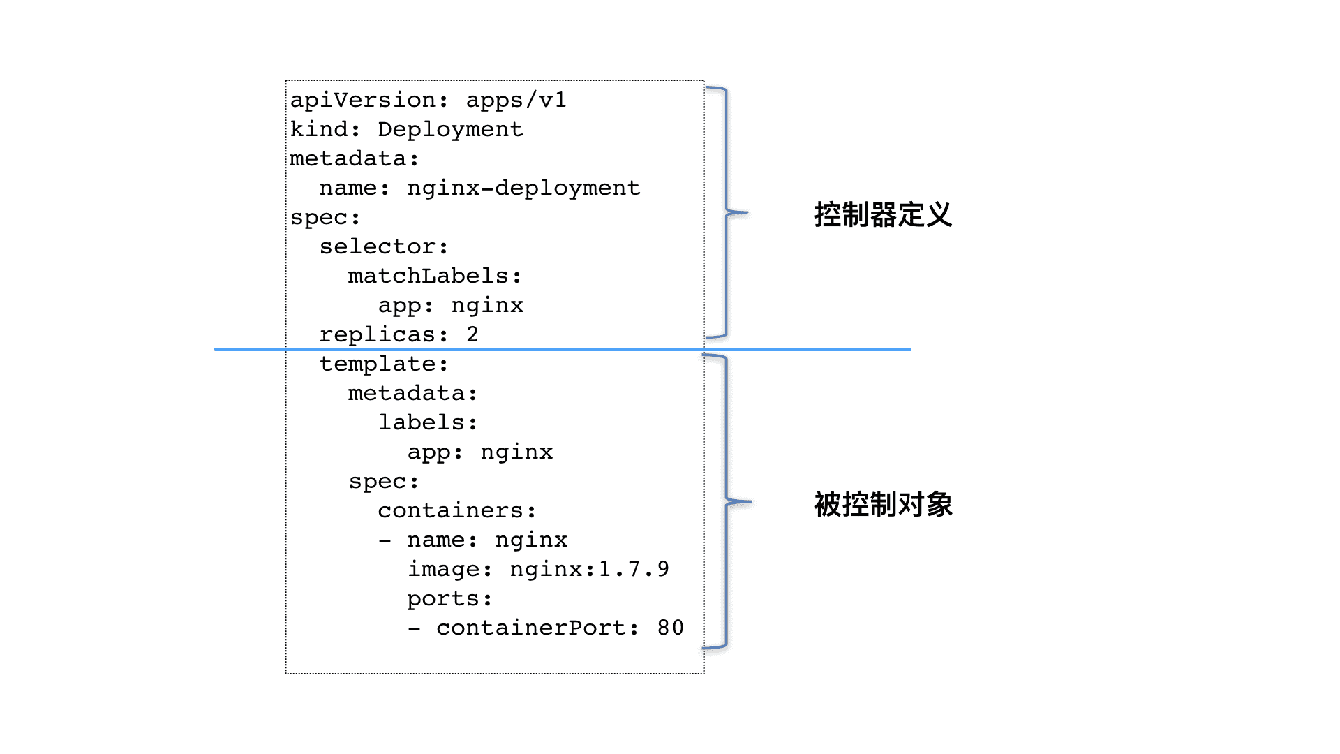 如上图所示,类似 Deployment 这样的一个控制器,实际上都是由上半部分的控制器定义(包括期望状态),加上下半部分的被控制对象的模板组成的。