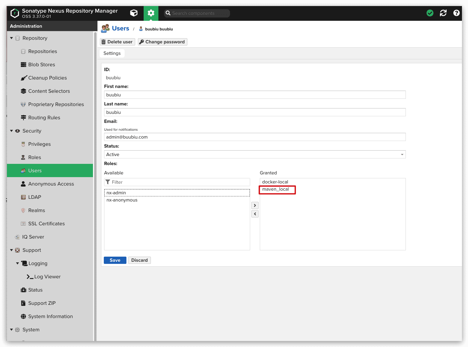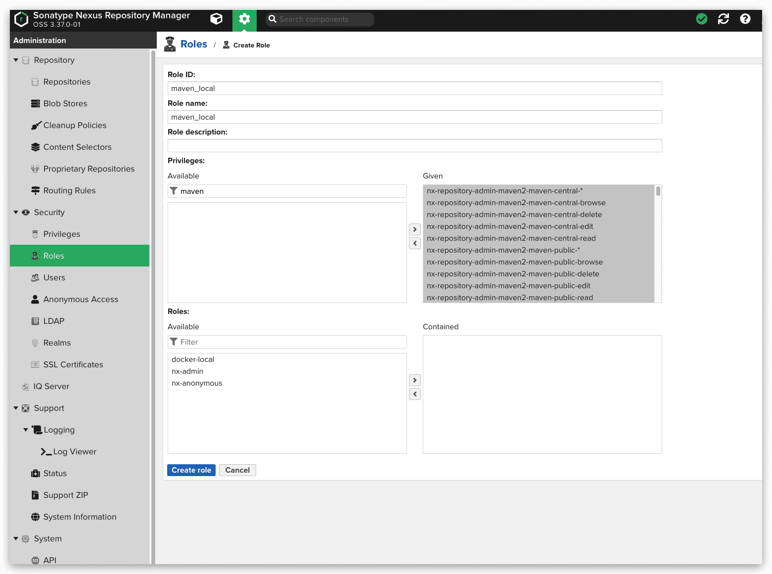 添加用户规则:菜单 Security->Roles->Create role 在 Privlleges 选项搜索 maven 把相应的规则移动到右边的框中然后保存。