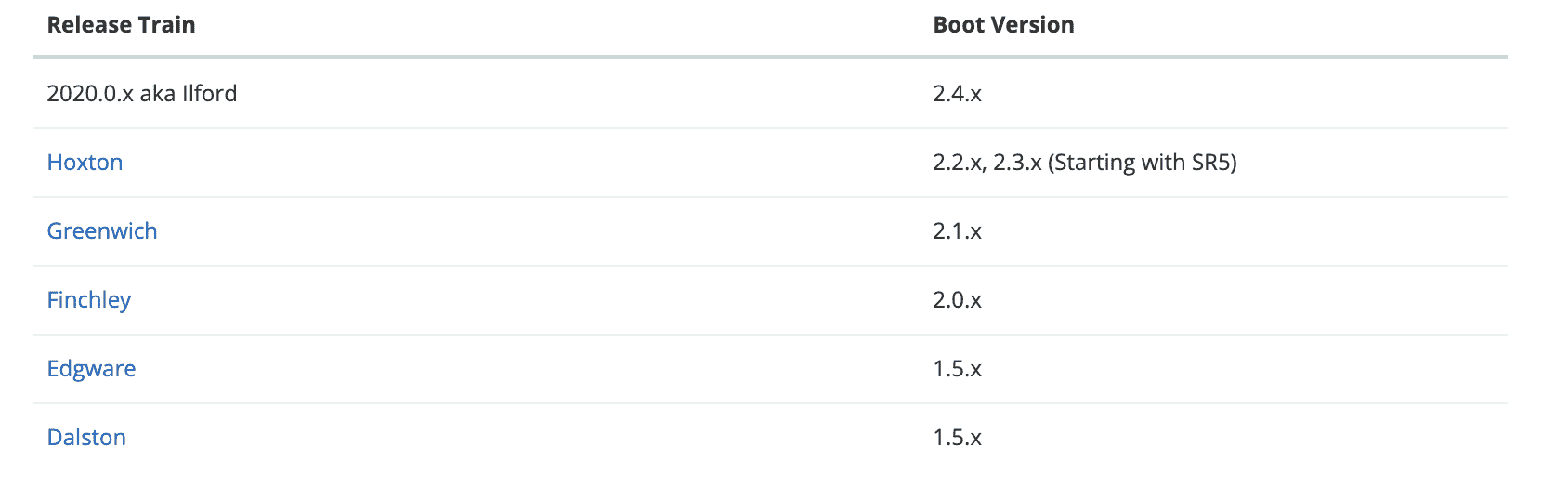 Spring Cloud is an umbrella(伞) project consisting of independent projects with, in principle, different release cadences. To manage the portfolio a BOM (Bill of Materials) is published with a curated set of dependencies on the individual project (see below). The release trains have names, not versions, to avoid confusion with the sub-projects. The names are an alphabetic sequence (so you can sort them chronologically) with names of London Tube stations (“Angel” is the first release, “Brixton” is the second). When point releases of the individual projects accumulate to a critical mass, or if there is a critical bug in one of them that needs to be available to everyone, the release train will push out “service releases” with names ending “.SRX”, where “X” is a number. —[摘自官网]
