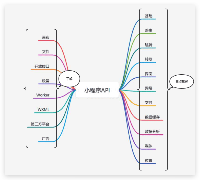 微信小程序框架所提供的API接口也是相当完备的,如果说小程序组件是用来构建小程序的视图层,那么小 程序API则在小程序逻辑层担当重任。随着小程序版本的更新迭代,目前小程序框架 API分类已经达到了 19个大类,如下图所示。