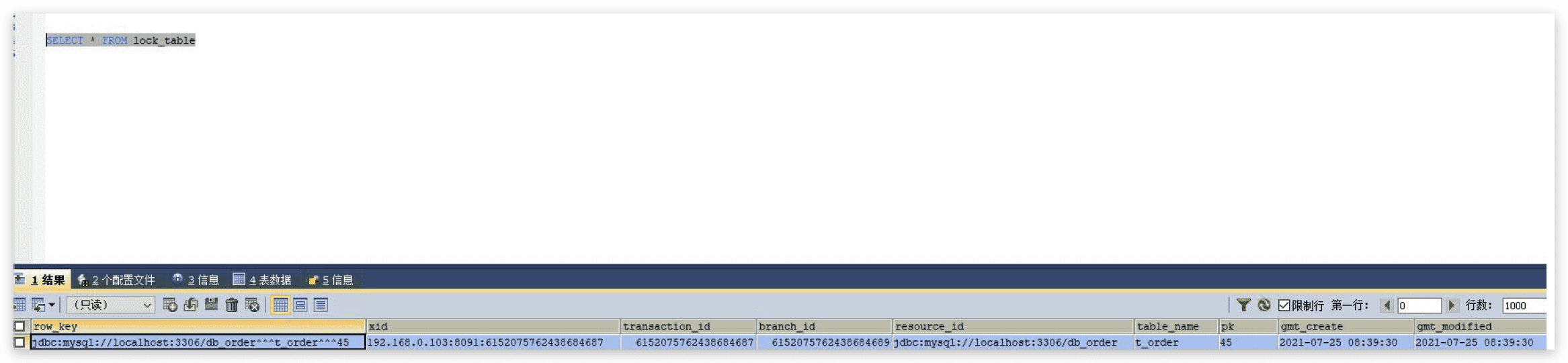 CREATE TABLE IF NOT EXISTS `lock_table` ( `row_key` VARCHAR(128) NOT NULL, `xid` VARCHAR(96), `transaction_id` BIGINT, `branch_id` BIGINT NOT NULL, `resource_id` VARCHAR(256), `table_name` VARCHAR(32), `pk` VARCHAR(36), `gmt_create` DATETIME, `gmt_modified` DATETIME, PRIMARY KEY (`row_key`), KEY `idx_branch_id` (`branch_id`) ) ENGINE = InnoDB DEFAULT CHARSET = utf8;