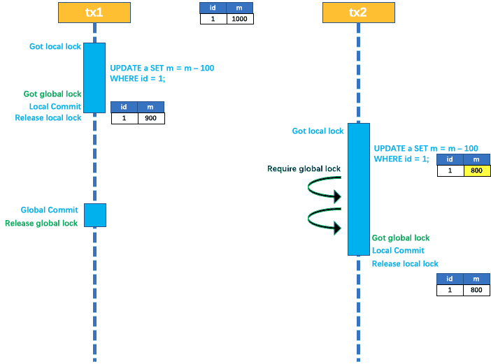 tx1 先开始,开启本地事务,拿到本地锁,更新操作 m = 1000 - 100 = 900。本地事务提交前,先拿到该记录的 全局锁 ,本地提交释放本地锁。 tx2 后开始,开启本地事务,拿到本地锁,更新操作 m = 900 - 100 = 800。本地事务提交前,尝试拿该记录的 全局锁 ,tx1 全局提交前,该记录的全局锁被 tx1 持有,tx2 需要重试等待 全局锁 。