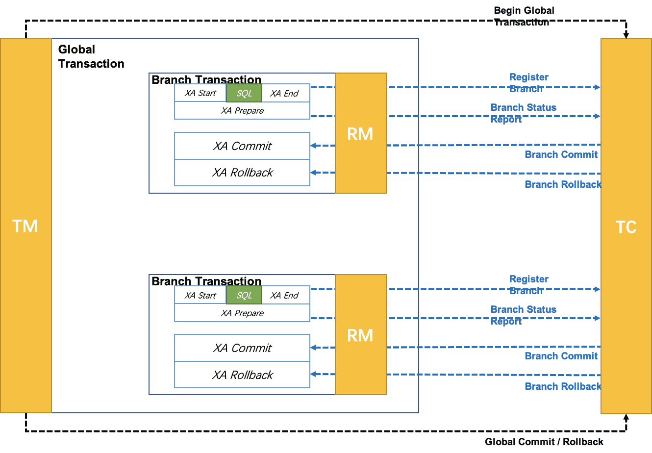 - XA start/XA end/XA prepare + SQL + 注册分支