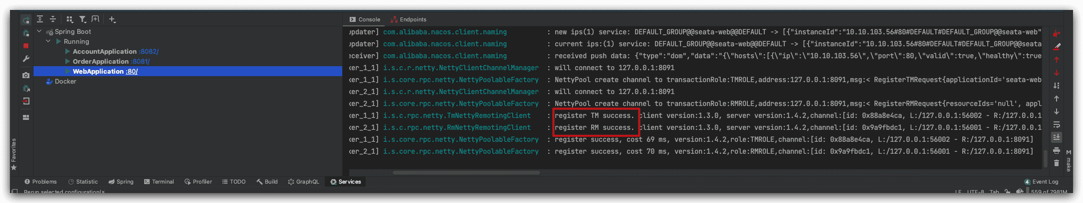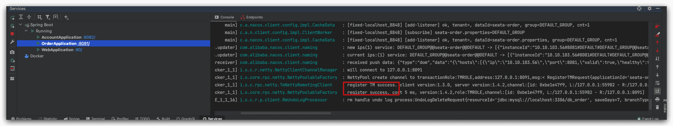 seata-order项目的TM注册成功: