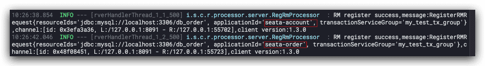 seata-server日志显示:两个RM在seata-server注册成功;
