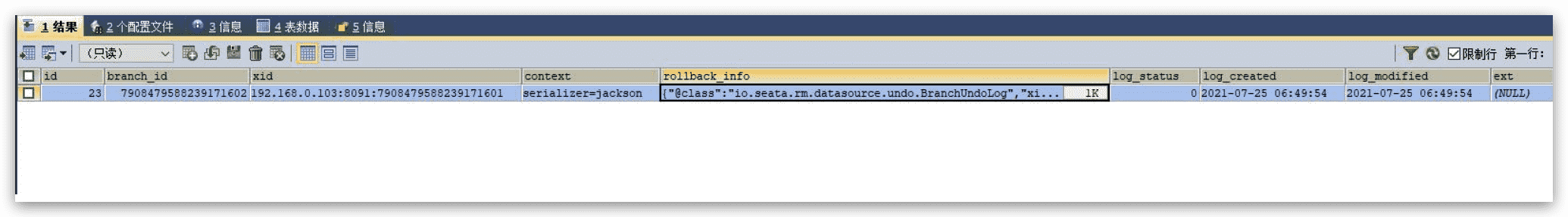 | CREATE TABLE `undo_log` ( `id` bigint(20) NOT NULL AUTO_INCREMENT, `branch_id` bigint(20) NOT NULL, `xid` varchar(100) NOT NULL, `context` varchar(128) NOT NULL, `rollback_info` longblob NOT NULL, `log_status` int(11) NOT NULL, `log_created` datetime NOT NULL, `log_modified` datetime NOT NULL, `ext` varchar(100) DEFAULT NULL, PRIMARY KEY (`id`), UNIQUE KEY `ux_undo_log` (`xid`,`branch_id`) ) ENGINE=InnoDB AUTO_INCREMENT=3 DEFAULT CHARSET=utf8