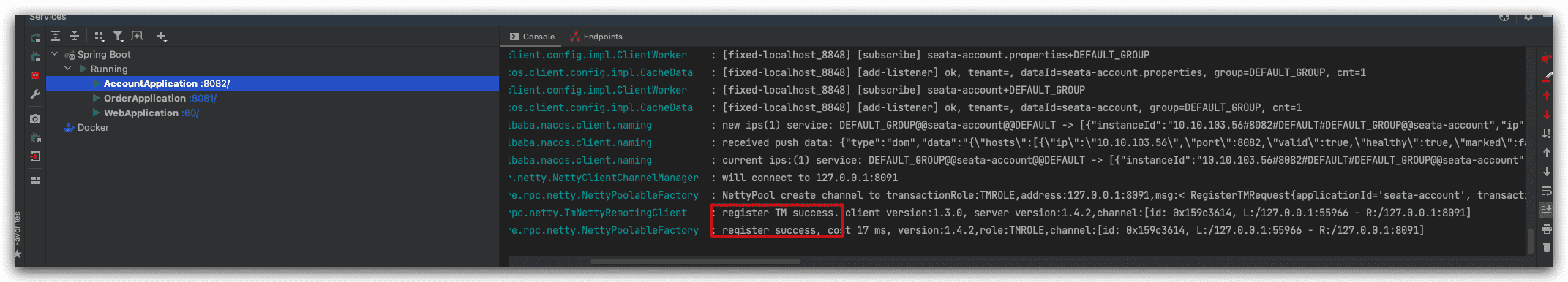 seata-account项目的TM注册成功: