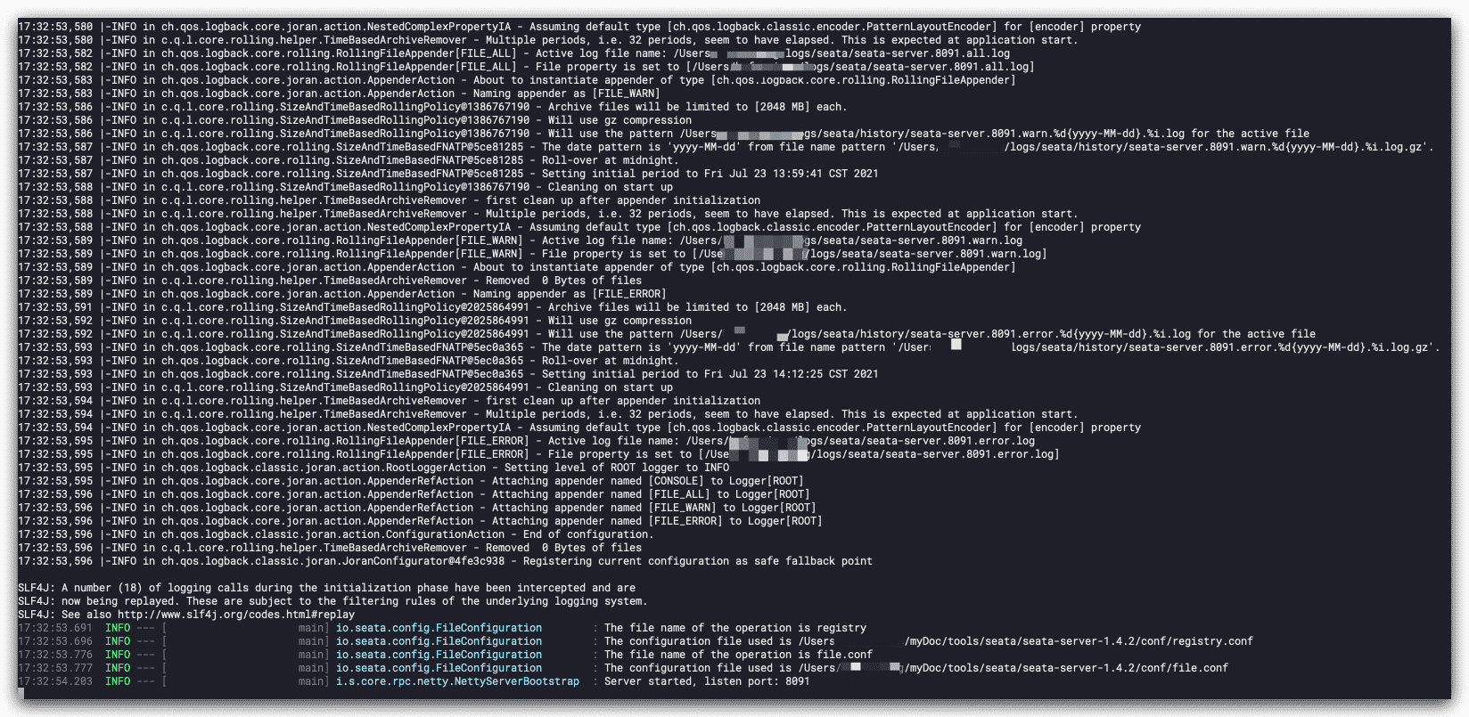 最后运行bin目录下的seata-server.sh启动seata-server,启动OK,监听端口8091