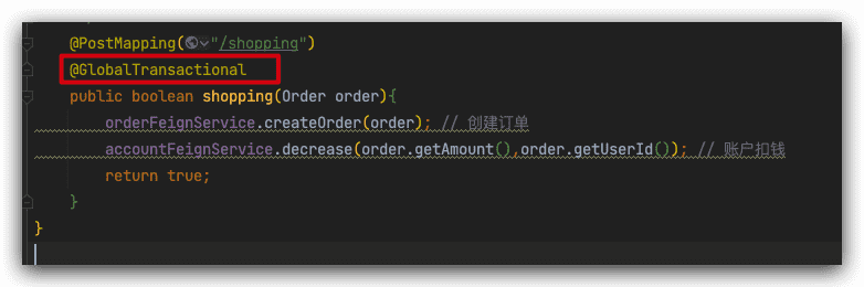 添加@GlobalTransactional注解