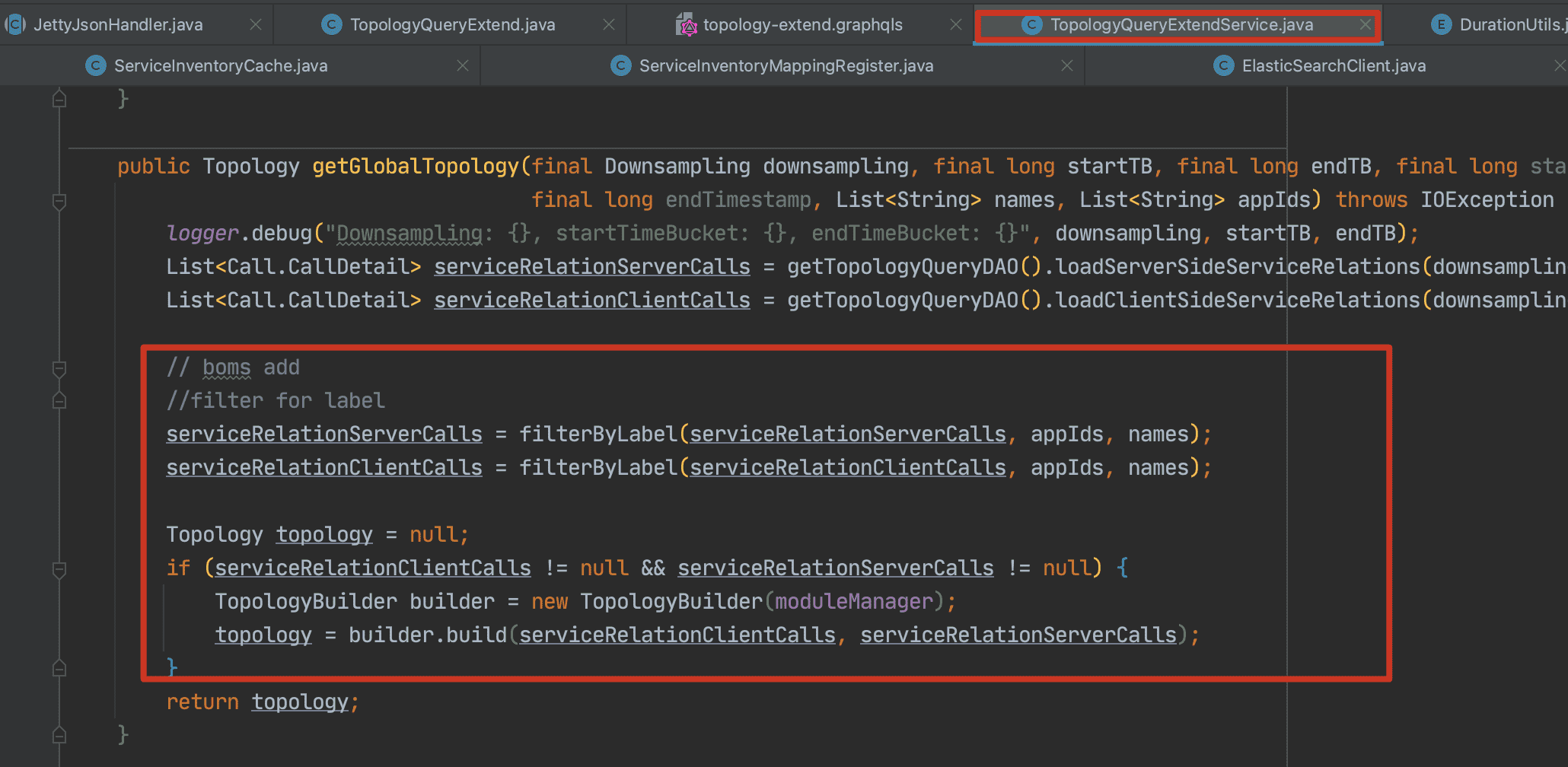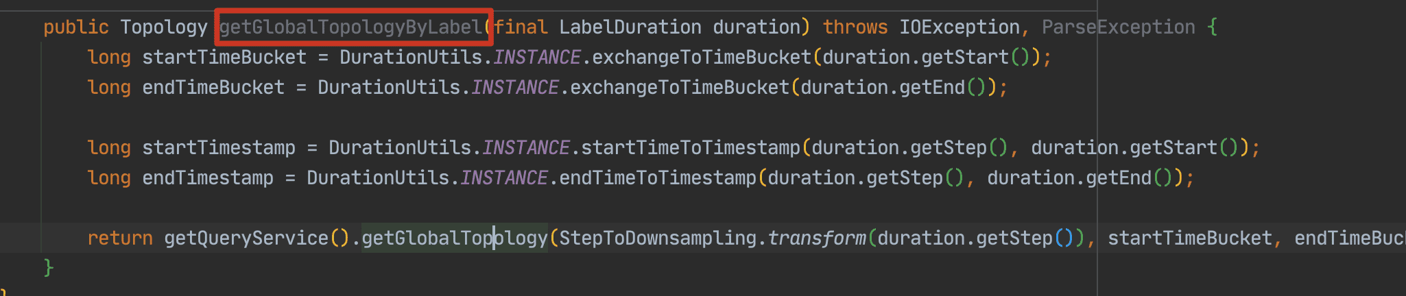 1 | public Topology getServicesTopology(final List<String> serviceIds, final Duration duration) throws IOException { |