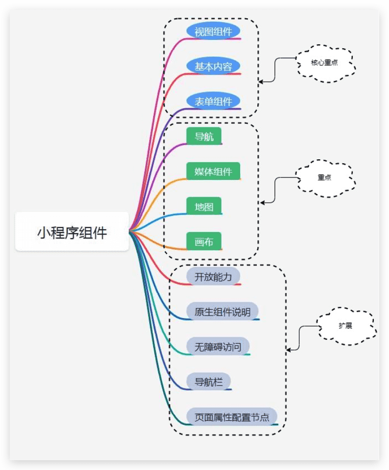 下方思维导图是小程序的组件,重点掌握核心组件和重点组件,了解扩展;