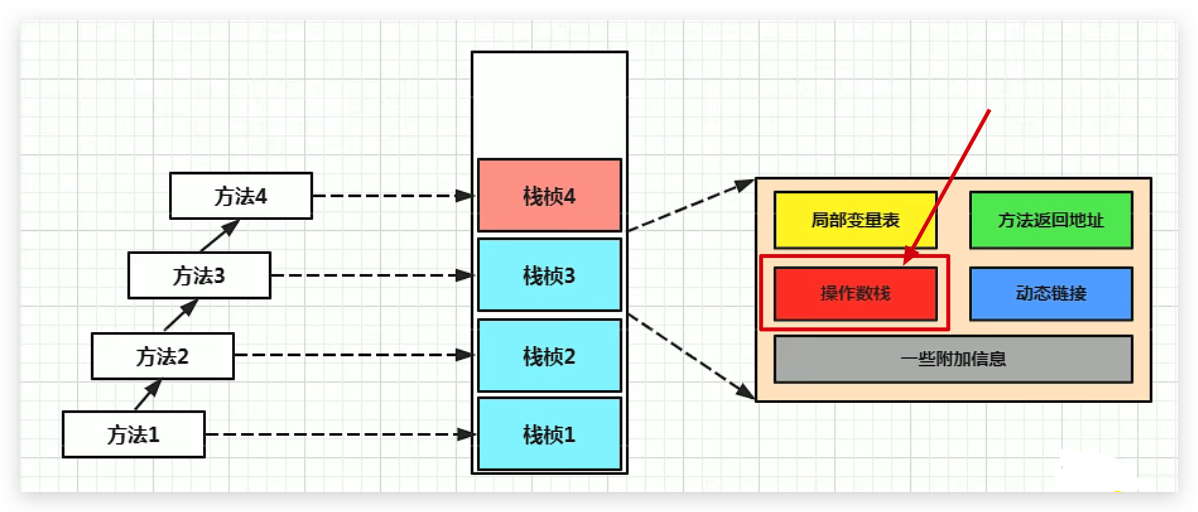 每一个独立的栈帧中除了包含局部变量表以外,还包含一个后进先出(Last-In-First-Out)的操作数栈,也可以称为 表达式栈(Expression Stack)